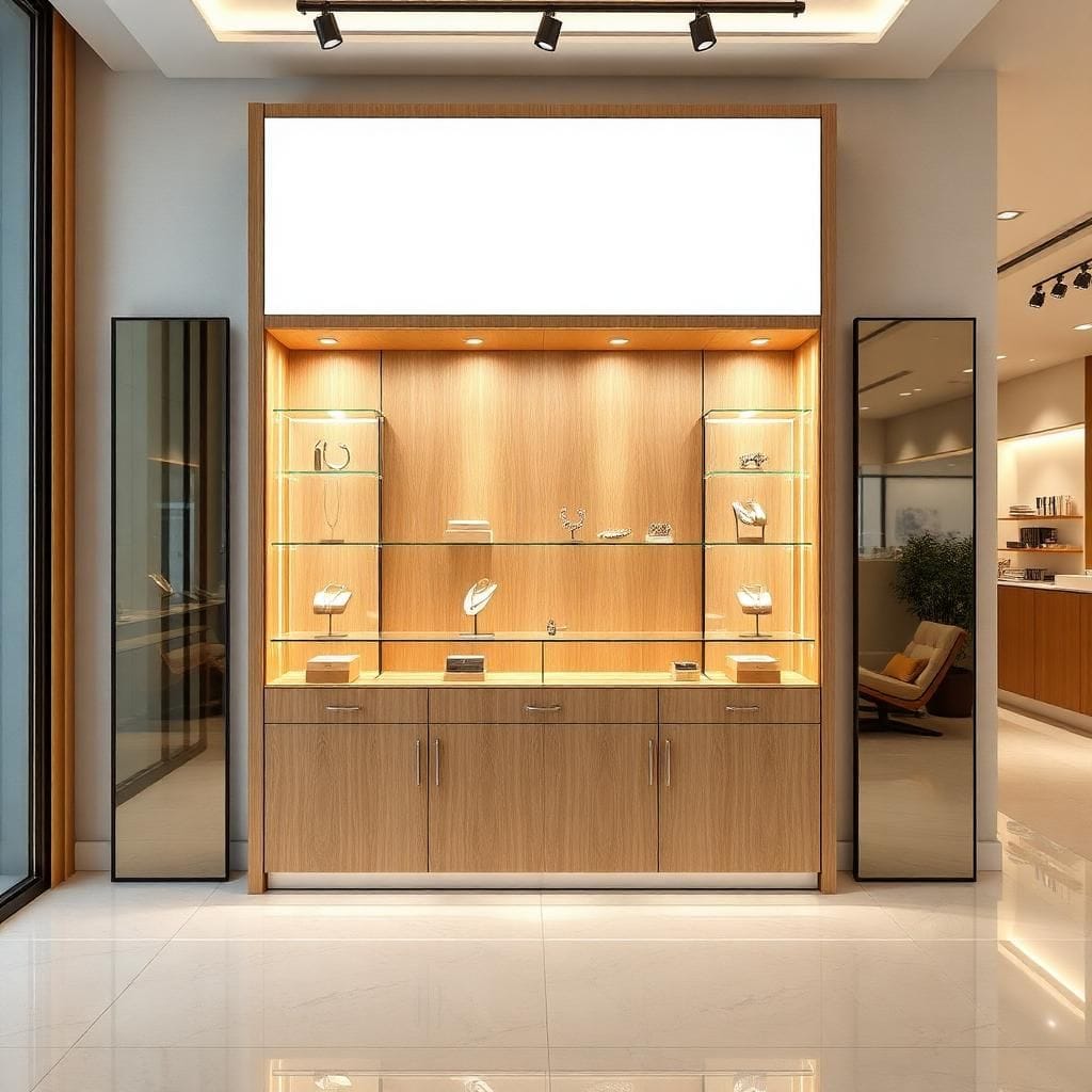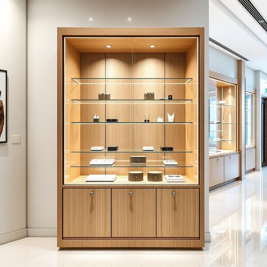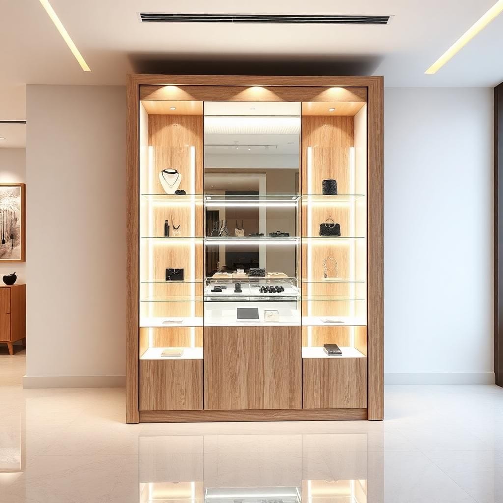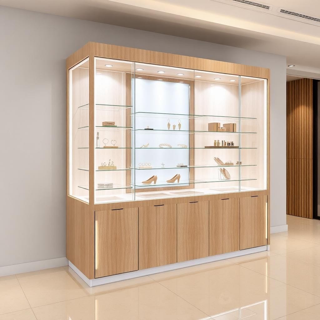 • Tủ gỗ cao cấp kết hợp kính LED: Gỗ tự nhiên phủ veneer kết hợp kính trong suốt và hệ thống đèn LED thông minh. Đây là lựa chọn lý tưởng cho showroom trang sức, đồng hồ cao cấp.