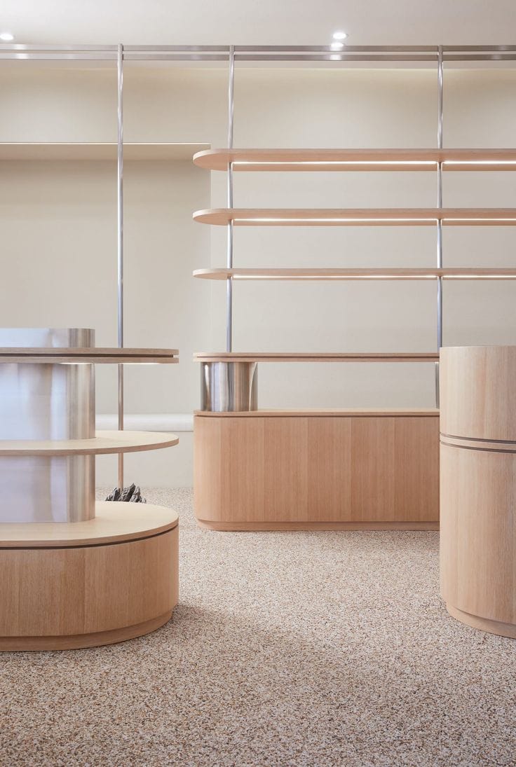 Một mẹo nhỏ được nhiều cửa hàng áp dụng là sử dụng kệ trung tâm để trưng bày sản phẩm nổi bật. Các kệ sát tường sẽ dùng để trưng bày số lượng lớn sản phẩm cùng loại, giúp không gian cửa hàng vừa gọn gàng vừa chuyên nghiệp.