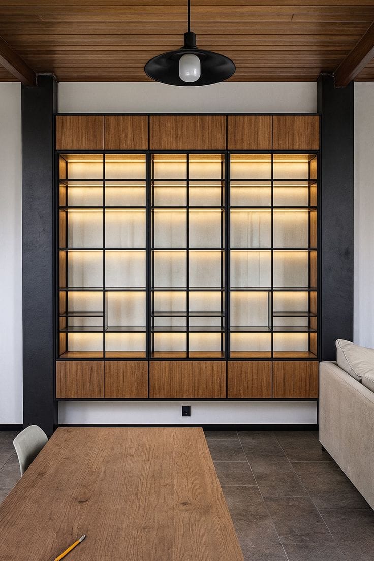 • Kết hợp sắt sơn đen, gỗ mộc, kính trong.