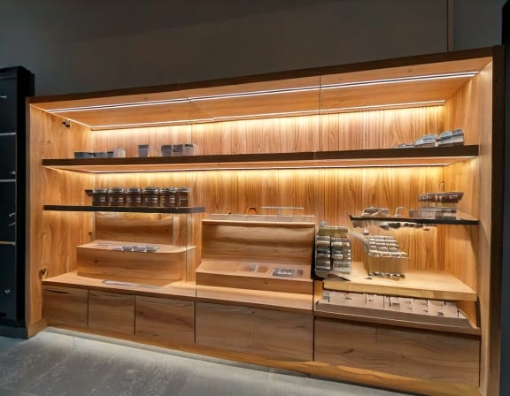 • Hệ thống đèn LED hắt viền và chiếu điểm giúp mỗi sản phẩm được làm nổi bật có chủ đích.