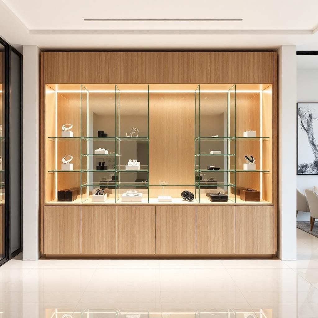 Phong cách sang trọng: Dùng gỗ tự nhiên, veneer cao cấp, ánh sáng vàng ấm, khung inox mạ vàng. Thích hợp cho showroom trang sức, đồng hồ.