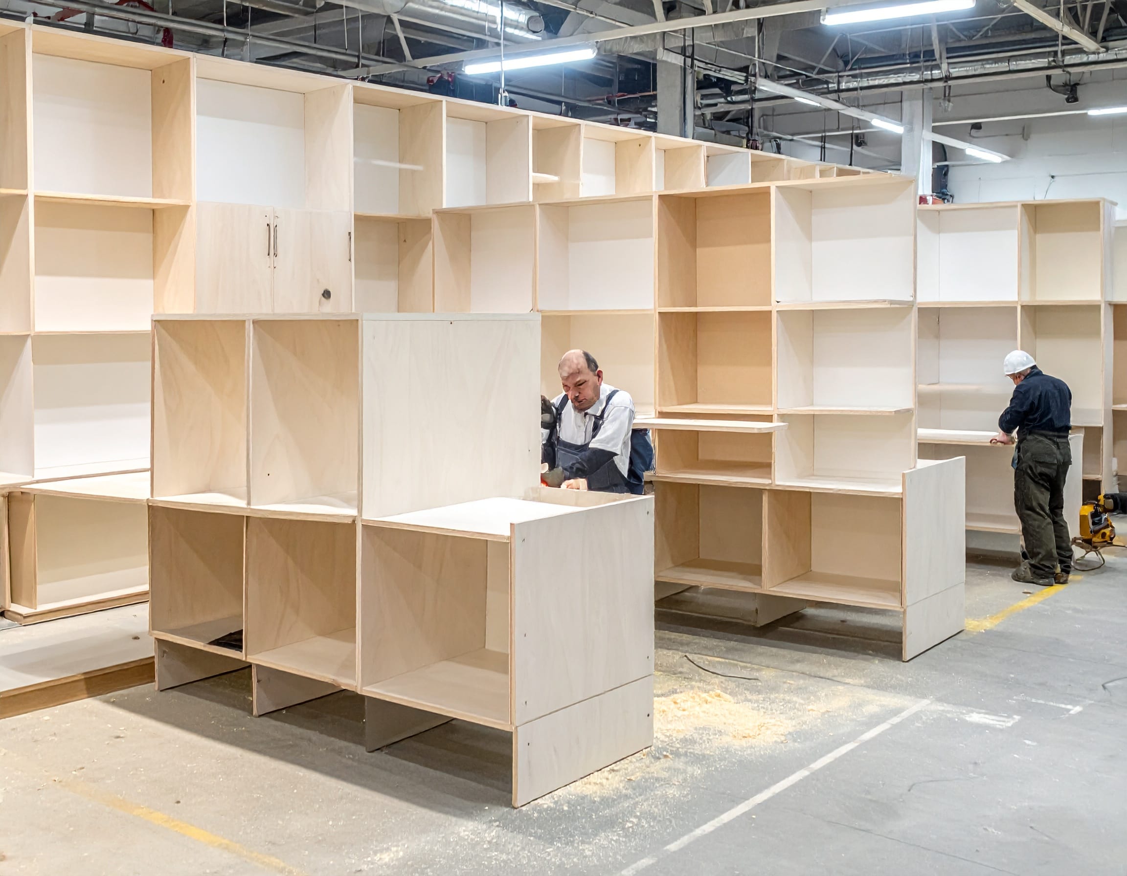 Tiếp theo là gia công vật liệu tại xưởng. Tại Bluecons, các loại vật liệu như gỗ MDF chống ẩm, gỗ MFC hoặc kính cường lực được cắt và xử lý bằng máy móc hiện đại để đảm bảo độ chính xác cao.