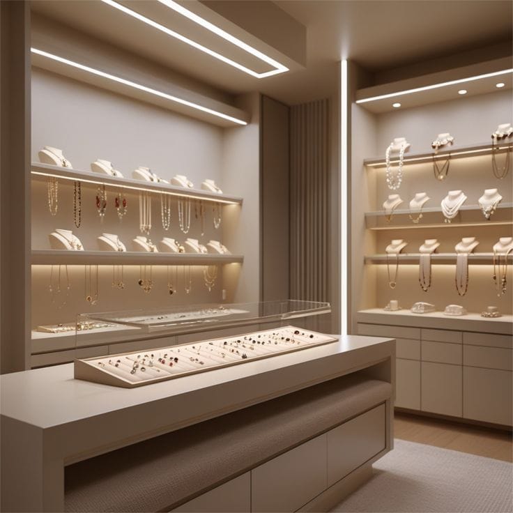 Ngoài ra, hệ thống đèn chiếu sáng cũng rất quan trọng. Ánh sáng LED trắng hoặc vàng nhẹ giúp trang sức trở nên lấp lánh và nổi bật hơn. Khi được chiếu sáng đúng cách, các sản phẩm vàng bạc sẽ thu hút ánh nhìn của khách hàng ngay từ xa.