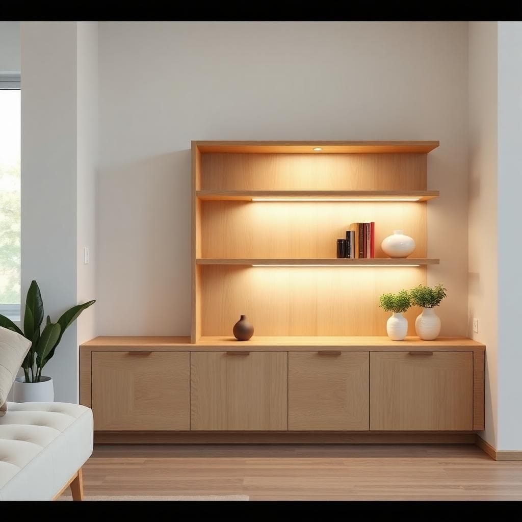 • Phối màu vân gỗ sáng + LED vàng nhẹ để hài hòa không gian.