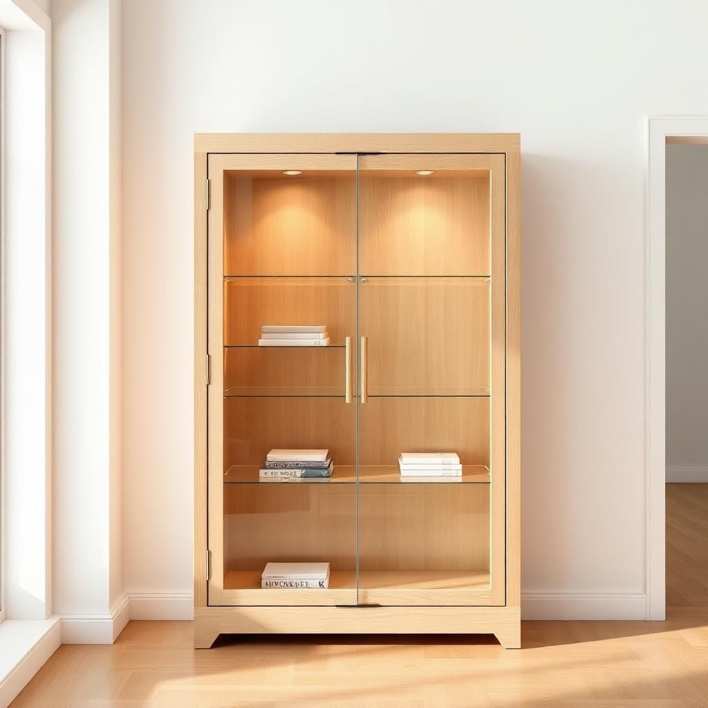 → Dựa vào vật liệu (gỗ, kính, inox, sắt), kích thước và phụ kiện (đèn LED, khóa, ray).