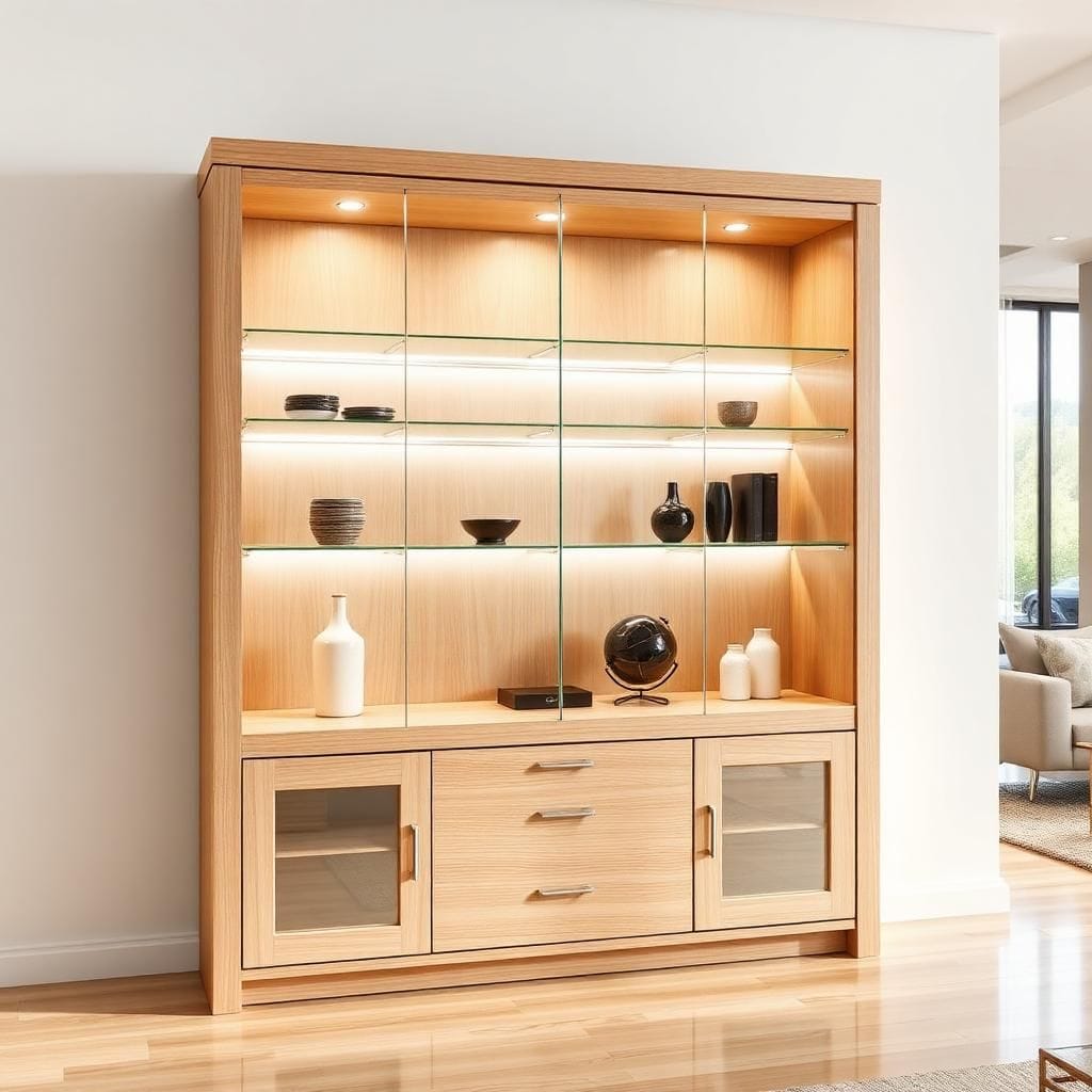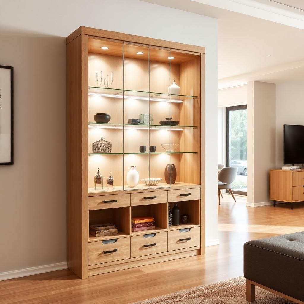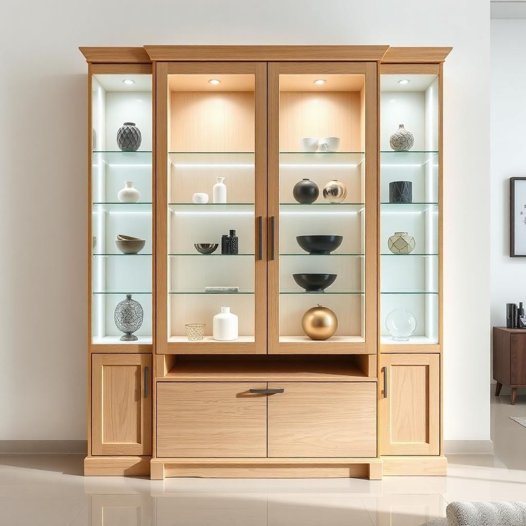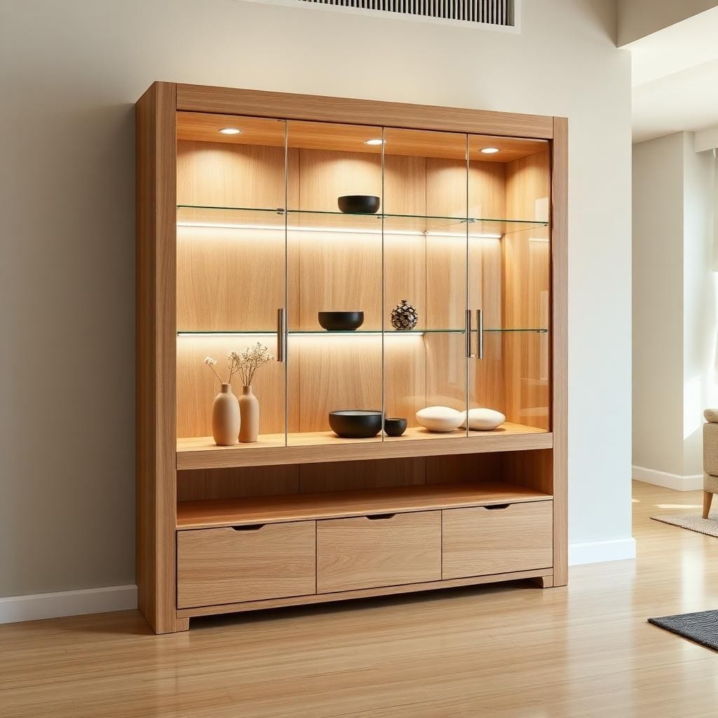 → Giá dựa trên vật liệu (gỗ, kính, inox, sắt), kích thước và phụ kiện (LED, khóa, ray).